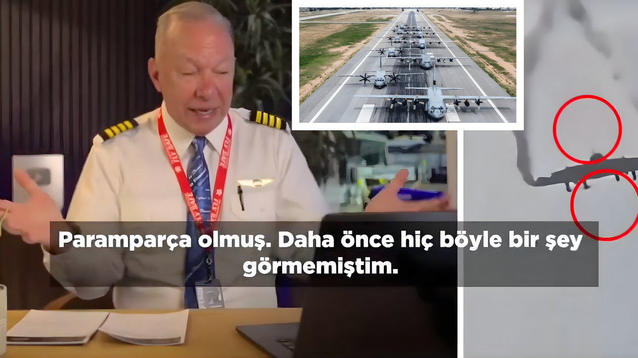 "C130 Hercules nakliye uçağı seyir halinde iken parçalanıyor. Bu inanılmaz bir durum. Kanatların uçlarından akan şey yakıt. C130 yakıt boşaltırken kanat uçlarından böyle bir akış gerçekleşiyor. Görüntülerde eksik olan ise uçağın kuyruğu ve kokpit kısmı. Paramparça olmuş. Daha önce böyle bir şey görmemiştim.
