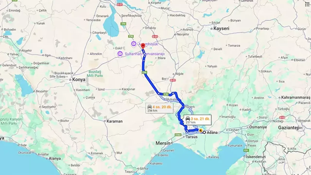 Adana ile Aksaray arasındaki yolculuk süresi kullanılan ulaşım aracına göre değişiyor.