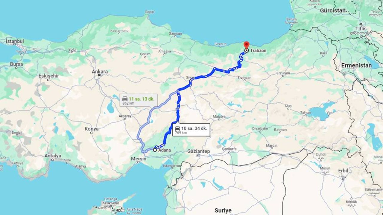 Adana’dan Trabzon’a veya Trabzon’dan Adana’ya yapılan yolculuklarda süre ve mesafe, güzergâh tercihlerine bağlı olarak küçük farklılıklar gösterebiliyor. Karayolu, otobüs ve uçak seçenekleri iki şehir arasındaki seyahat için farklı alternatifler sunuyor.