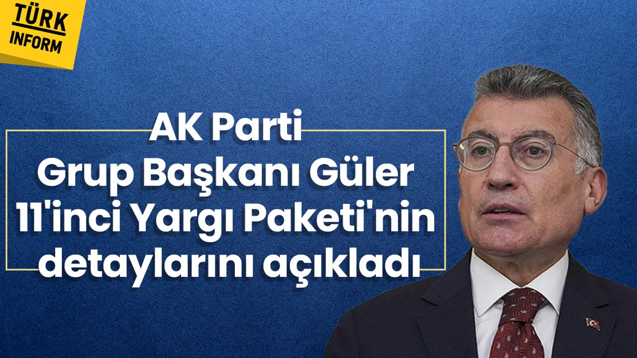 AK Parti Grup Başkanı Abdullah Güler, Türkiye Büyük Millet Meclisi (TBMM) Başkanlığına sunulan ve kamuoyunda 11'inci Yargı Paketi olarak bilinen kanun teklifine ilişkin Meclis'te bir basın toplantısı düzenledi. Güler, hazırlanan teklifin suç işlenmesinin önlenmesi, caydırıcılığın artırılması ve yargı süreçlerinin hızlandırılmasını hedeflediğini belirtti. Teklifin içeriğinde dolandırıcılıkla mücadele, bilişim suçları, trafik güvenliği, hakaret suçlarının kapsamı ve Covid-19 izni kapsamındaki denetimli serbestlik uygulamalarına dair çeşitli düzenlemeler yer aldığı bildirildi.