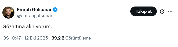 Akademisyen ve yazar Dr. Emrah Gülsunar, sosyal medya hesabından yaptığı paylaşımda gözaltına alındığını duyurdu. Gülsunar, paylaşımında yalnızca “Gözaltına alınıyorum” ifadesine yer verdi.