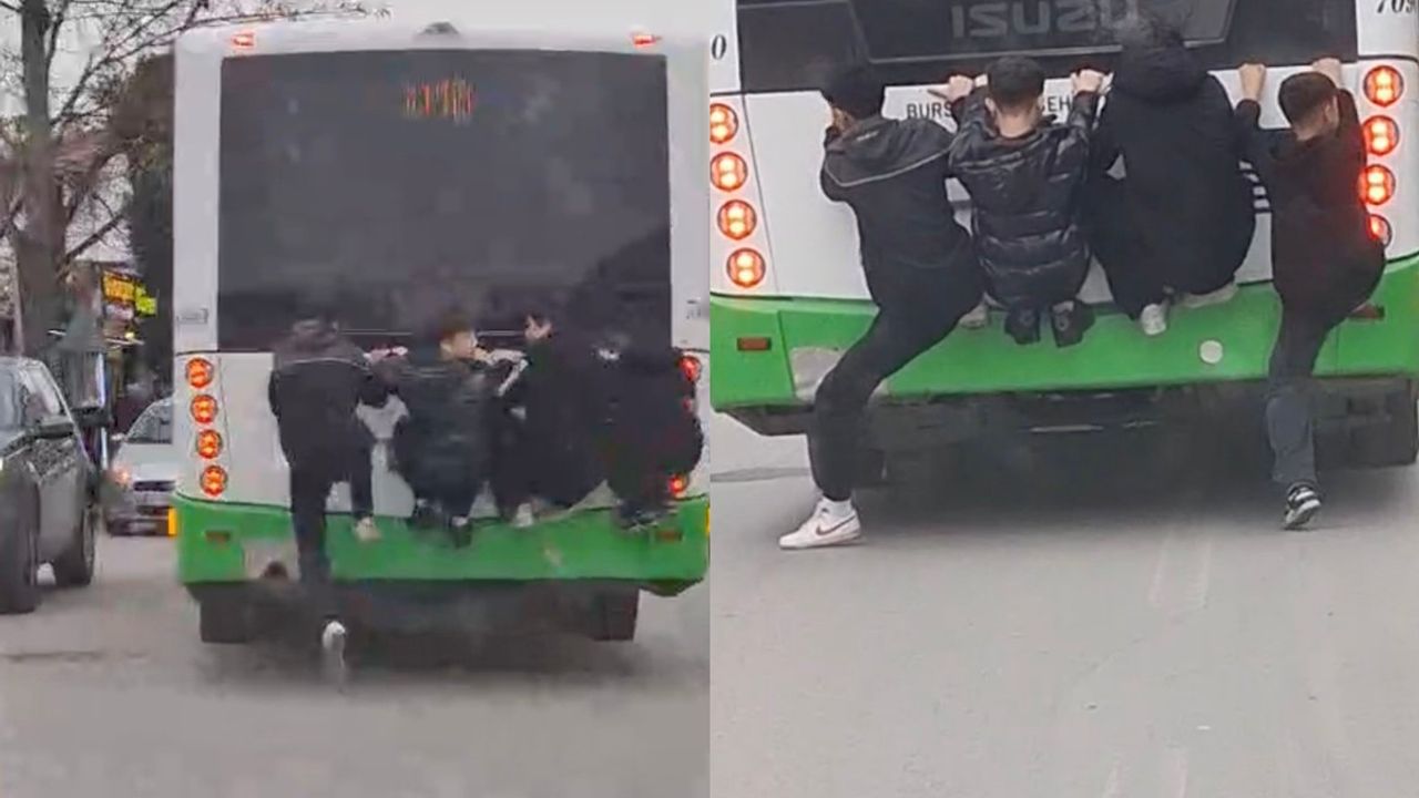 Bursa’nın Yıldırım ilçesinde, dört lise öğrencisinin özel halk otobüsünün arkasına tutunarak ilerlemesi çevredekilere korku dolu anlar yaşattı. Millet Mahallesi’nde meydana gelen olay, bir vatandaşın cep telefonu kamerasına yansıdı. Görüntülerde öğrencilerin hiçbir güvenlik önlemi olmadan otobüsün arkasına tutunduğu görülüyor.