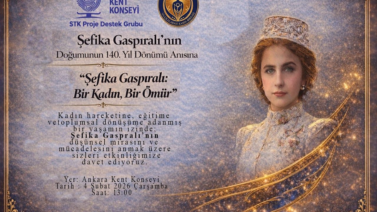 Ankara Kent Konseyi STK Proje Destek Çalışma Grubu ile Şefika Gaspıralı Kadın Birliği iş birliğinde, Şefika Gaspıralı’nın düşünsel mirasını ve kadın hareketine katkılarını anmak amacıyla bir program düzenlenecek. “Şefika Gaspıralı: Bir Kadın, Bir Ömür” başlıklı etkinlikte, Gaspıralı’nın yaşamı, fikirleri ve mücadele süreci katılımcılarla paylaşılacak.