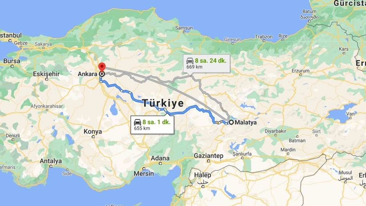 Ankara ile Malatya arasındaki mesafe kullanılan güzergâha bağlı olarak değişmektedir: