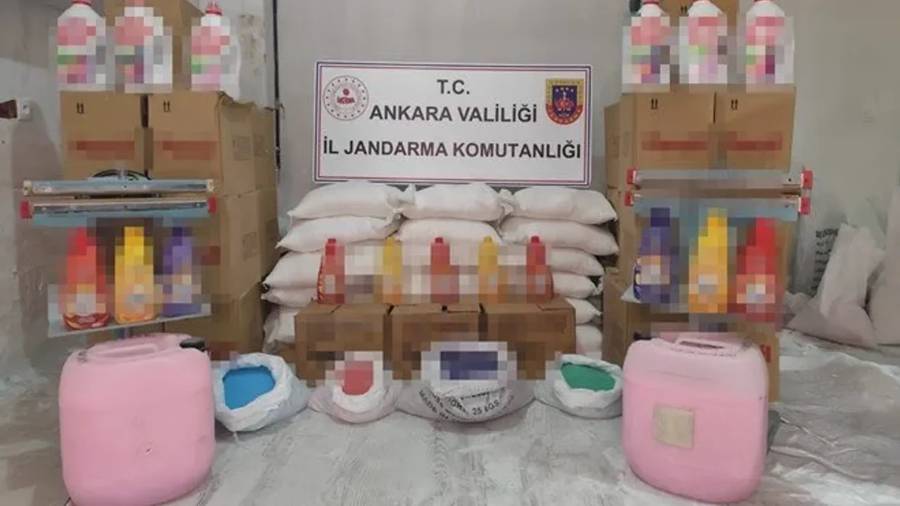 Ankara İl Jandarma Komutanlığı Kaçakçılık ve Organize Suçlarla Mücadele Şubesi ekipleri, Yenimahalle’de Y.S. ve M.S.’ye ait depoda sahte temizlik malzemesi üretildiği bilgisi üzerine operasyon düzenledi. Operasyonda, piyasaya sürülmeye hazır 500 litre sıvı deterjan, 2 adet ambalaj makinası, 500 kilogram tuz ile 120 kilogram farklı renklerde boncuk tuz ele geçirildi. Ele geçirilen ürünlerin piyasa değerinin yaklaşık 1 milyon 200 bin lira olduğu bildirildi. Olayla ilgili Y.S. ve M.S. gözaltına alınarak adli işlem başlatıldı.