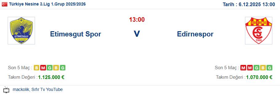 Edirnespor ise sezonun en zor deplasman serilerinden birini yaşıyor. Kırmızı-beyazlı ekip dış sahada 5 maçtır kazanamıyor. Ligde topladığı 7 puanla son sırada yer alan Edirnespor için Ankara deplasmanı çıkış arayışı anlamı taşıyor. İki takım arasında sezonun ilk yarısında oynanan mücadelede Etimesgut Spor rakibini 2-0 mağlup etmişti.