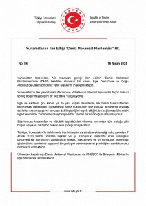 Dışişleri Bakanlığı, Yunanistan'ın Ege ve Doğu Akdeniz'deki 'Deniz Mekansal Planlaması'na ilişkin sert bir açıklama yaptı. Bakanlık, Yunanistan’ın ilan ettiği deniz planlamasında Türkiye’nin deniz yetki alanlarını ihlal ettiğini belirterek, “Bu adımlar ülkemiz için hiçbir hukuki sonuç doğurmayacaktır.” ifadelerini kullandı.