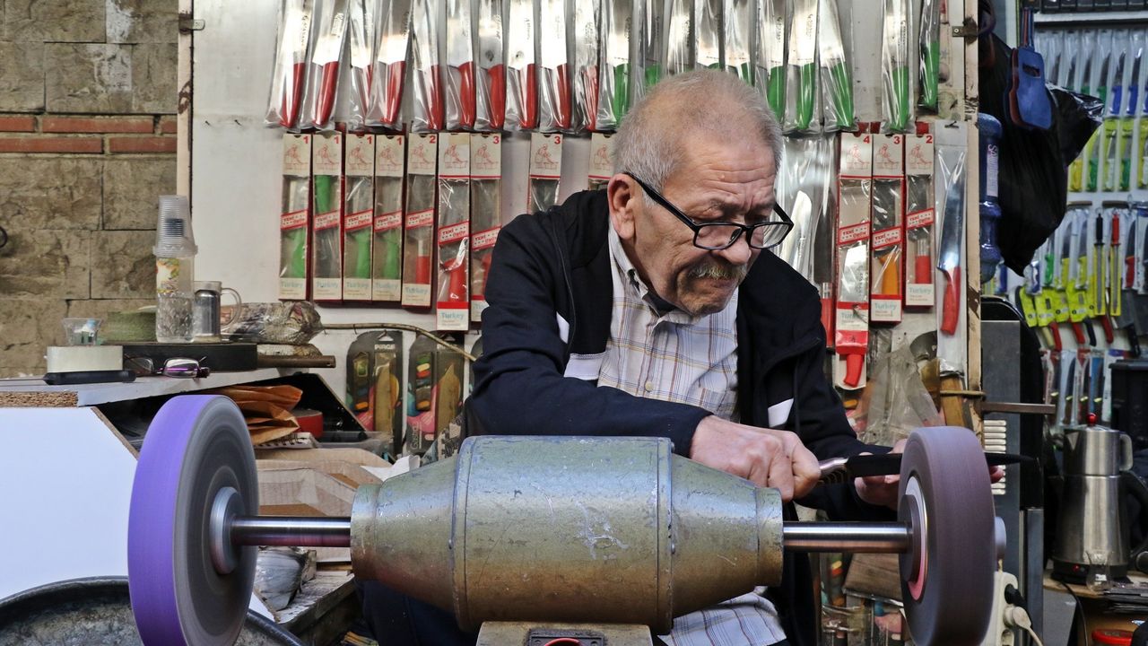 Antalya Muratpaşa'da 65 yaşındaki Mehmet Şakar, bıçak bileme ustalığını 50 yıldır ilk günkü heyecanla sürdürüyor. Meslek, ailesinde dededen toruna aktarılarak Şakar’a kadar gelmiş ve onun oğlu da işi devam ettiriyor.