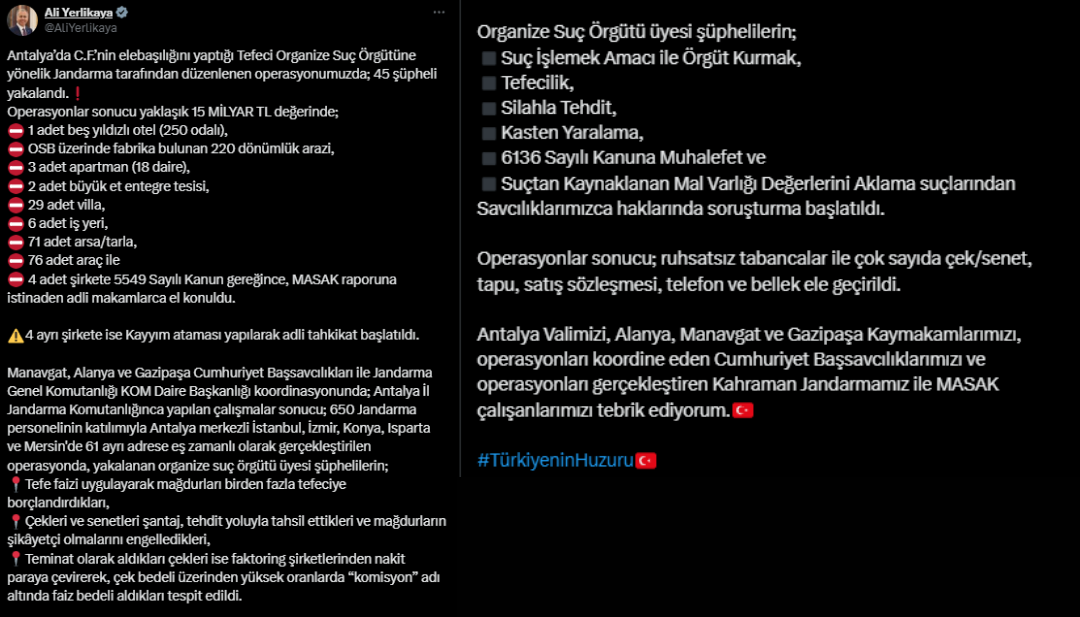 Antalya'da, C.F. liderliğindeki organize suç örgütüne yönelik düzenlenen geniş çaplı operasyonda büyük bir darbe vuruldu. İçişleri Bakanı Ali Yerlikaya'nın sosyal medya üzerinden duyurduğu bilgilere göre, Jandarma'nın gerçekleştirdiği operasyonda 45 şüpheli gözaltına alındı, 4 şirkete kayyum atandı.