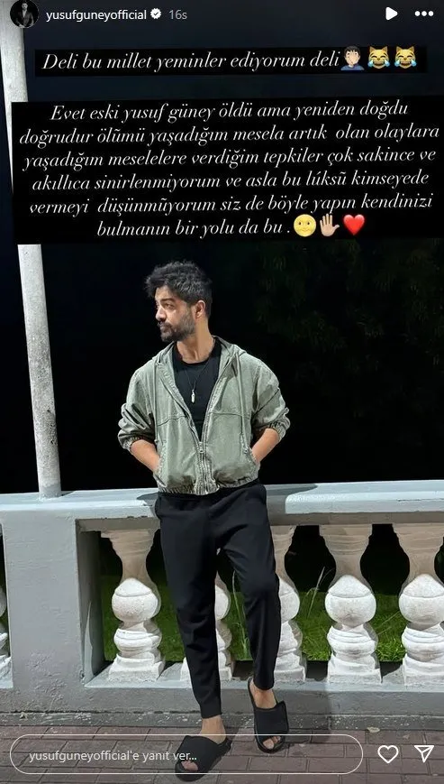 Instagram hesabından “Eski Yusuf Güney öldü ama yeniden doğdu” notunu düşen Güney, şu ifadeleri kullandı:“Doğrudur, ölümü yaşadığım. Artık olaylara verdiğim tepkiler çok daha sakince ve akıllıca. Sinirlenmiyorum ve bu lüksü kimseye de vermeyeceğim.”