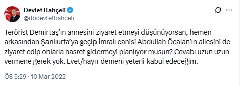 Devlet Bahçeli'nin 10 Mart 2022 tarihinde, o dönem Selahattin Demirtaş'ın annesini ziyaret etmeyi planlayan Kemal Kılıçdaroğlu'nu eleştirmek amacıyla attığı tweette şu ifadeler yer alıyordu:
