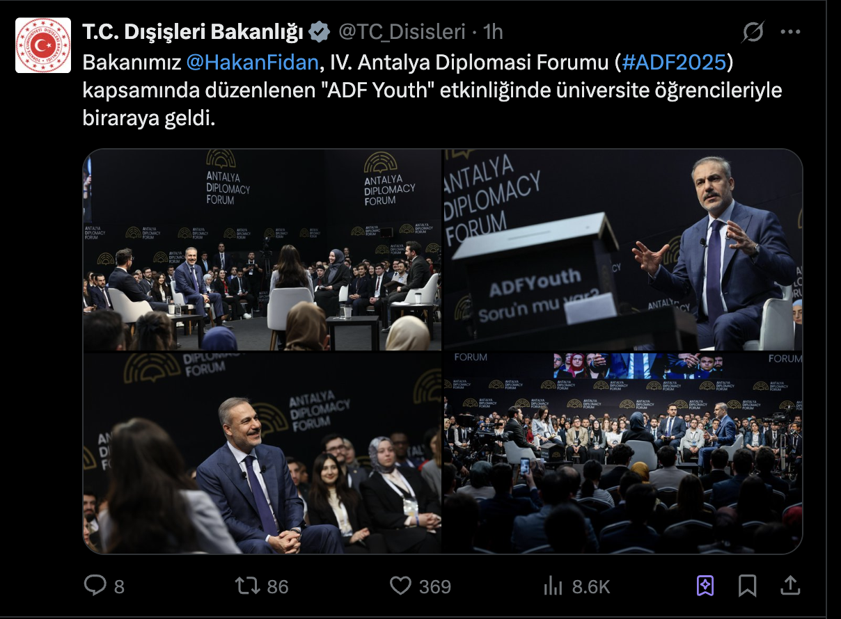 Dışişleri Bakanı Hakan Fidan, 4. Antalya Diplomasi Forumu (ADF) kapsamında "ADF Youth" etkinliğinde üniversite öğrencileriyle bir araya geldi.