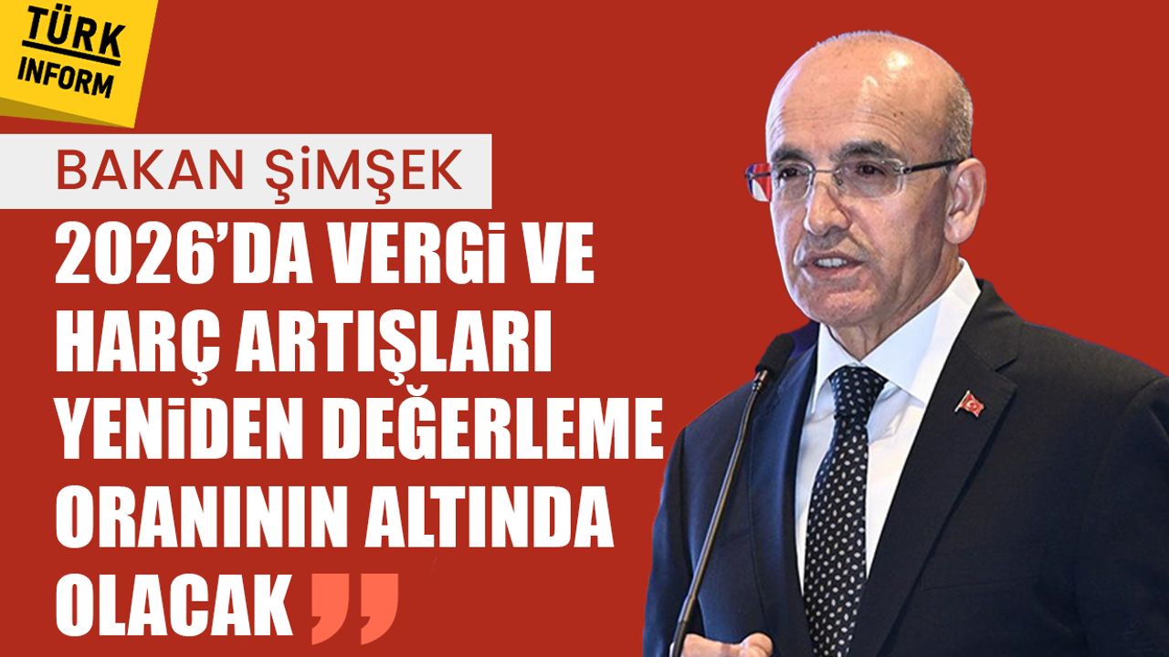 Hazine ve Maliye Bakanı Mehmet Şimşek, 2026 yılında vergi ve harç artışlarının yeniden değerleme oranının altında belirleneceğini açıkladı. Bakan Şimşek uygulamanın enflasyon hedefleriyle uyumlu olacağını ve maliye politikasıyla dezenflasyon sürecine destek sağlayacağını vurguladı.