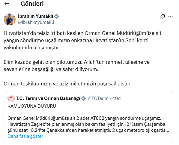 Bakan Yumaklı, acı haberi şu sözlerle duyurdu: "Elim kazada şehit olan pilotumuza Allah’tan rahmet, ailesine ve sevenlerine başsağlığı ve sabır diliyorum. Orman teşkilatımızın ve aziz milletimizin başı sağ olsun."