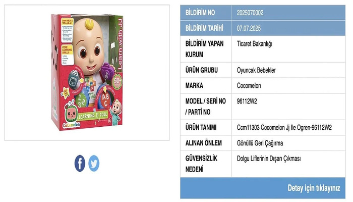 Ticaret Bakanlığı, 7 Temmuz 2025 tarihli duyurusunu Güvensiz Ürün Bilgi Sistemi (GÜBİS) üzerinden kamuoyuyla paylaştı. Denetimler sonucu, Cocomelon markalı bazı peluş oyuncak bebeklerin güvenlik standartlarını karşılamadığı ve özellikle küçük yaştaki çocuklar için boğulma riski taşıdığı belirtildi.
