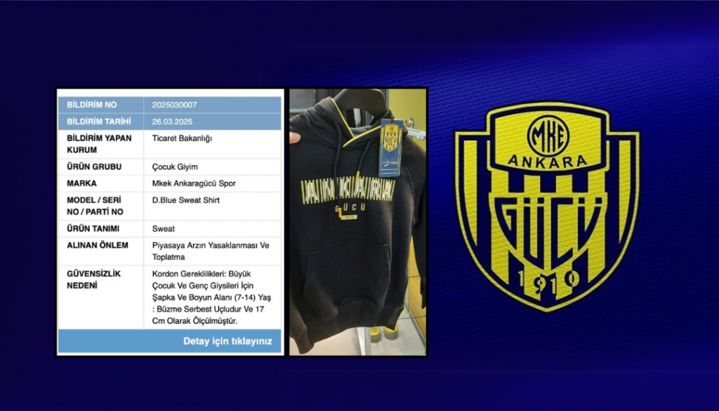 Ankaragücü’nün çocuklar için ürettiği sweatshirt’ün tasarımında boğulma riski taşıyan tehlikeli unsurlar bulunduğu belirtildi. Bu nedenle, ürünün satışının durdurulmasına ve piyasadan toplatılmasına karar verildi.