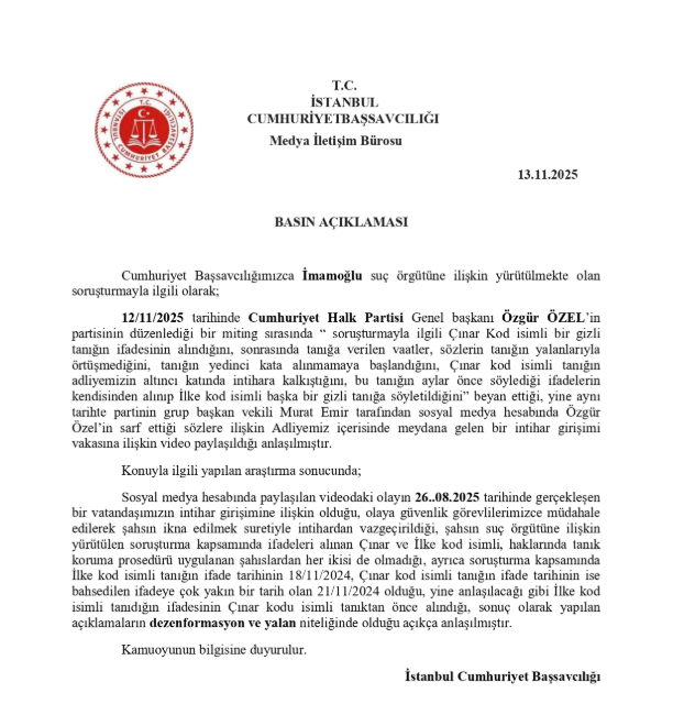 İstanbul Cumhuriyet Başsavcılığı, CHP Genel Başkanı Özgür Özel'in 12 Kasım 2025 tarihli mitingde "İmamoğlu suç örgütü" soruşturması hakkındaki iddialarına ilişkin bir basın açıklaması yayımladı. Başsavcılık, 13 Kasım 2025 tarihli açıklamasında, Özel'in "gizli tanık Çınar'ın intihara kalkıştığı" ve "ifadesinin başka bir gizli tanığa ('İlke') söylettirildiği" yönündeki iddialarının "dezenformasyon ve yalan" olduğunu duyurdu.