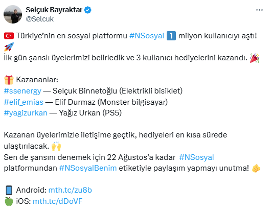 Paylaşımda, ilk çekilişin bugün yapılacağı belirtildi. Çekilişe katılmak isteyen kullanıcıların 22 Ağustos’a kadar #NSosyalBenim etiketiyle Next Sosyal platformunda paylaşım yapmaları gerektiği ifade edildi.