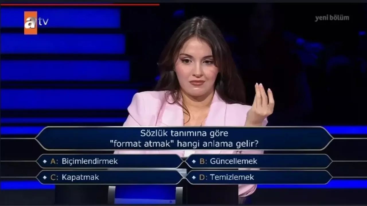 Soruda dört seçenek vardı: A) Biçimlendirmek B) Güncellemek C) Kapatmak D) Temizlemek. Yarışmanın sıkı takipçileri bu soruya doğru yanıtın “Biçimlendirmek” olduğunu biliyor ama o anki gerilim herkesin nabzını yükseltti.