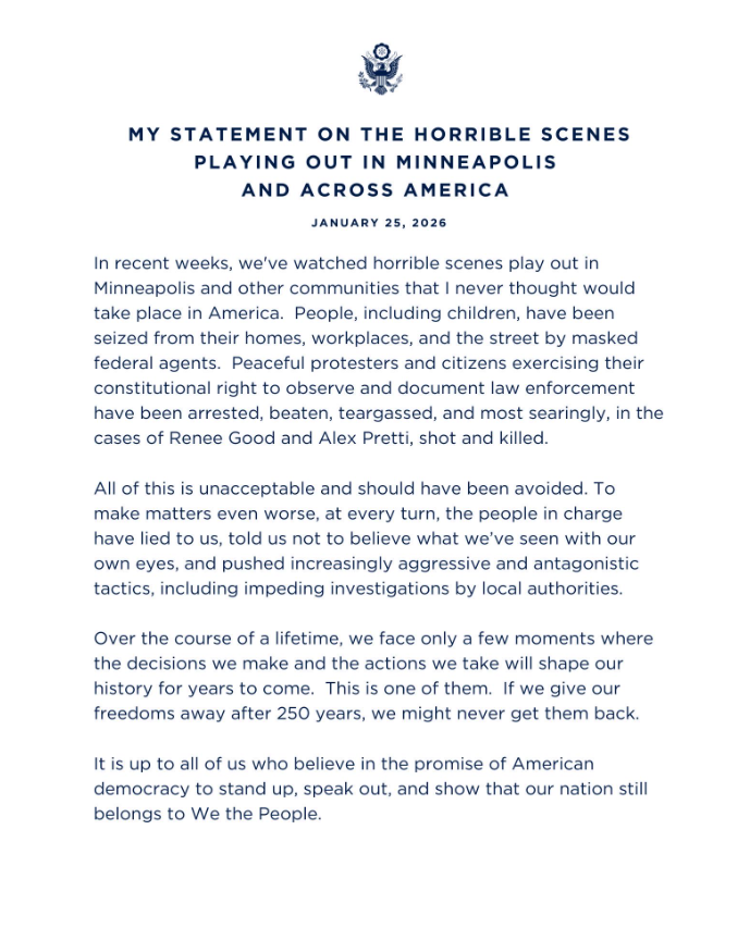 "Son haftalarda, Minneapolis'te ve diğer topluluklarda, Amerika'da yaşanacağını hiç düşünmediğim korkunç sahnelerin sergilendiğini izledik. Çocuklar da dahil olmak üzere insanlar evlerinden, iş yerlerinden ve sokaktan maskeli federal ajanlar tarafından zorla alındı. Barışçıl protestocular ve kolluk kuvvetlerini izleme ve belgeleme anayasal hakkını kullanan vatandaşlar tutuklandı, dövüldü, göz yaşartıcı gaza maruz kaldı ve en can yakıcısı, Renee Good ve Alex Pretti vakalarında olduğu gibi vurularak öldürüldü."