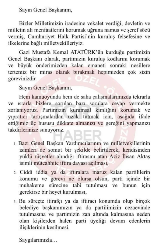 İddiaya göre, 20'yi aşkın CHP milletvekili tarafından yazılan ve Özgür Özel'e sunulan mektupta, partinin kurumsal kimliğini korumak adına üç temel talepte bulunuldu. Mektupta, "Ciddi iddia ya da iftiralara maruz kalan partililerin konumu ve görevi ne olursa olsun, parti içinde bir muhakeme sürecine tabi tutulması ve bunun için gerekirse bir heyet kurulması" istendi.