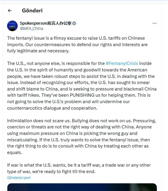 Çin Dışişleri Bakanlığı Sözcüsü Lin Cien, Washington’un gümrük tarifesi kararına ilişkin yaptığı açıklamada, "Eğer ABD gerçekten fentanil sorununu çözmek istiyorsa, en doğru yol Çin ile diyalog kurmak ve işbirliği yapmaktır" dedi. Ancak Cien, ABD’nin sorunu müzakere yoluyla çözmek yerine, doğrudan ekonomik baskıya yönelmesini sert bir dille eleştirdi.