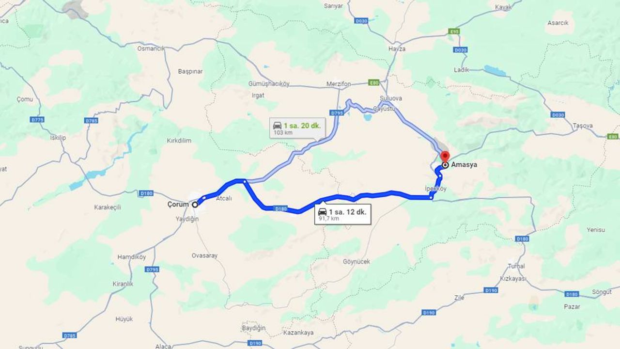 Çorum’dan yola çıkanlar D100 karayolunu takip ederek Amasya’ya ulaşabiliyor. Aynı güzergâh Amasya’dan Çorum yönünde de geçerli.