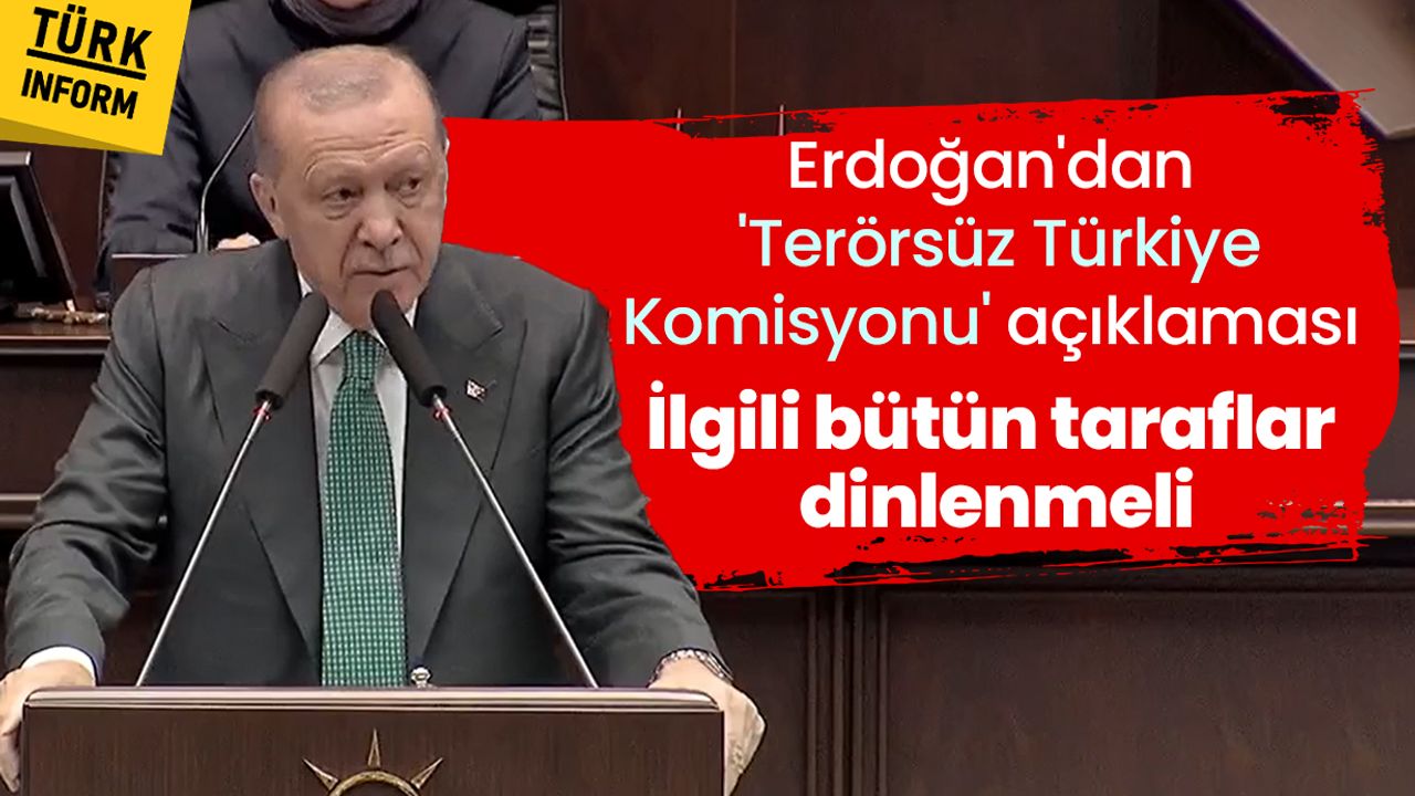 "Terörsüz Türkiye ve terörsüz bölge hedefine giden yolda yeni bir kavşağa ulaştığımız görülüyor" diyen Erdoğan, herkesin elini taşın altına koyması gerektiğini belirtti. Geçen hafta DEM Parti milletvekilleri Pervin Buldan ve Mithat Sancar ile Külliye'de "çok yapıcı bir görüşme" gerçekleştirdiklerini kaydeden Erdoğan, Milli Dayanışma, Kardeşlik ve Demokrasi Komisyonu'nun çalışmalarını övdü. Erdoğan, "Komisyon çatısı altında sürece dair tüm konuların tartışılmasını, kimsenin dışarıda bırakılmadan ilgili bütün tarafların dinlenmesini, aykırı da olsa farklı fikirlerin dile getirilmesini çok ama çok kıymetli buluyoruz. Komisyonumuzun yazacağı kapsamlı raporu ve önümüzdeki döneme dair belirleyeceği hukuki yol haritasını bu bakımdan önemsiyoruz" şeklinde konuştu.
