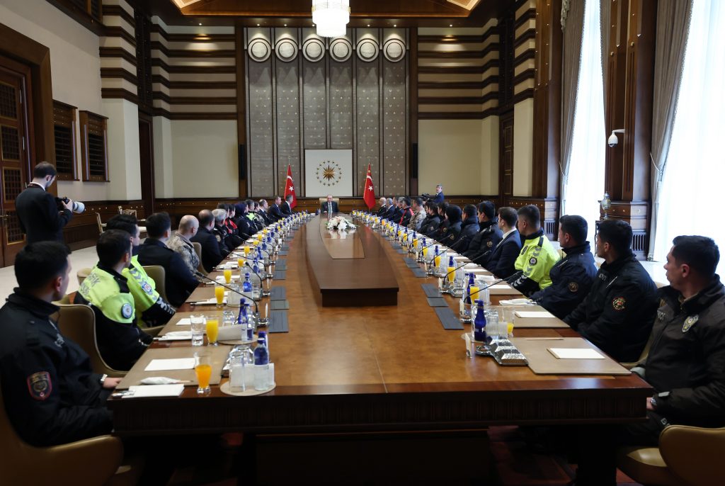 Cumhurbaşkanı Recep Tayyip Erdoğan, Türk Polis Teşkilatı'nın 180. kuruluş yıl dönümü nedeniyle Cumhurbaşkanlığı Külliyesi'nde özel bir tören gerçekleştirdi. Külliye'ye gelişinde polislerle kısa bir sohbet eden Erdoğan, ardından İçişleri Bakanı Ali Yerlikaya ile birlikte Polis Teşkilatı'nın heyetini kabul etti.