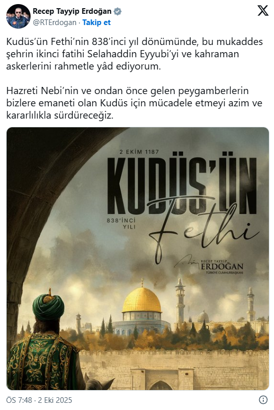 Cumhurbaşkanı Recep Tayyip Erdoğan, Kudüs’ün Fethi’nin 838’inci yıl dönümü dolayısıyla sosyal medya hesabından paylaşım yaptı. Erdoğan, Selahaddin Eyyubi ve askerlerini rahmetle andı, Kudüs için verilen mücadelenin kararlılıkla sürdürüleceğini vurguladı.
