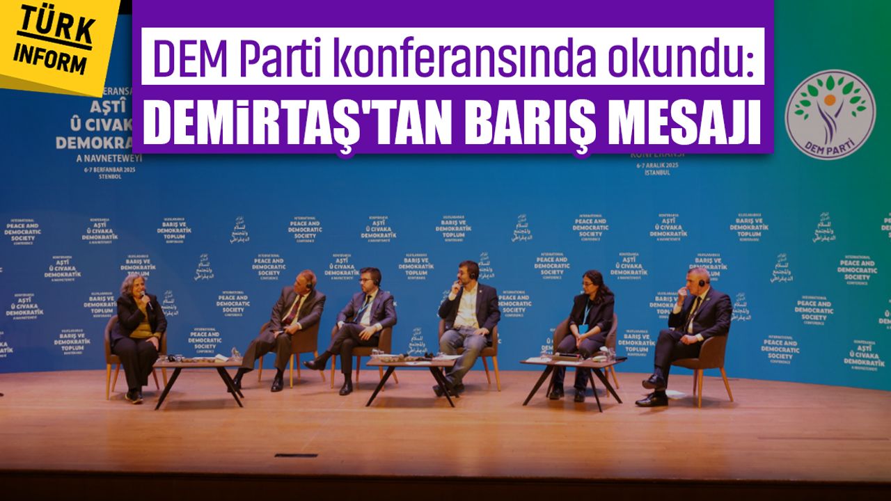 DEM Parti’nin İstanbul’da Cem Karaca Kültür Merkezi’nde düzenlediği Uluslararası Barış ve Demokratik Toplum Konferansı’nın ikinci günü yoğun katılımla devam etti. Konferansa, Edirne Cezaevi’nde tutuklu bulunan Selahattin Demirtaş ile Kandıra Cezaevi’nde tutuklu bulunan Figen Yüksekdağ ayrı ayrı mesaj gönderdi.