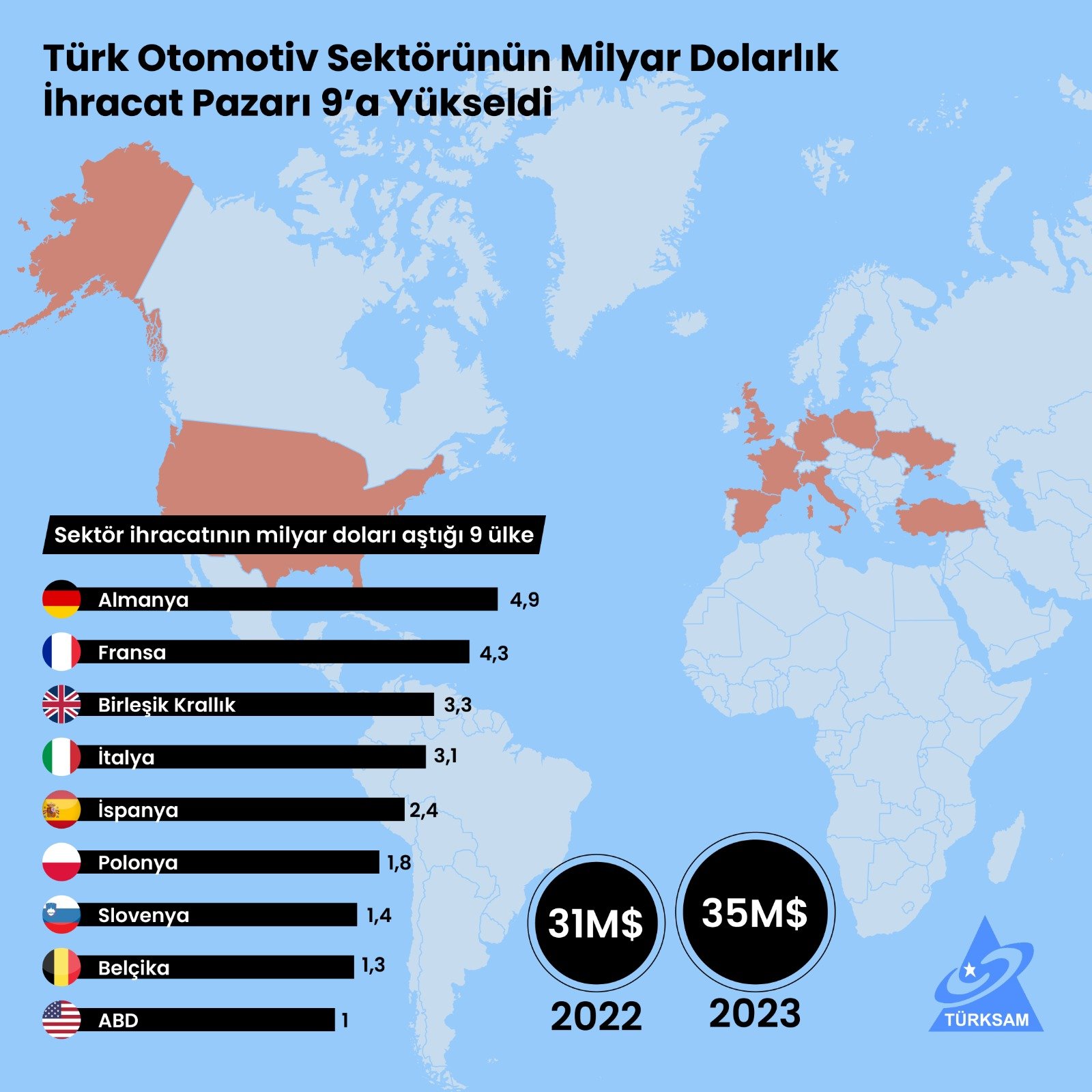 Türk otomotiv sektörünün milyar dolarlık ihracat pazarı 9'a yükseldi.