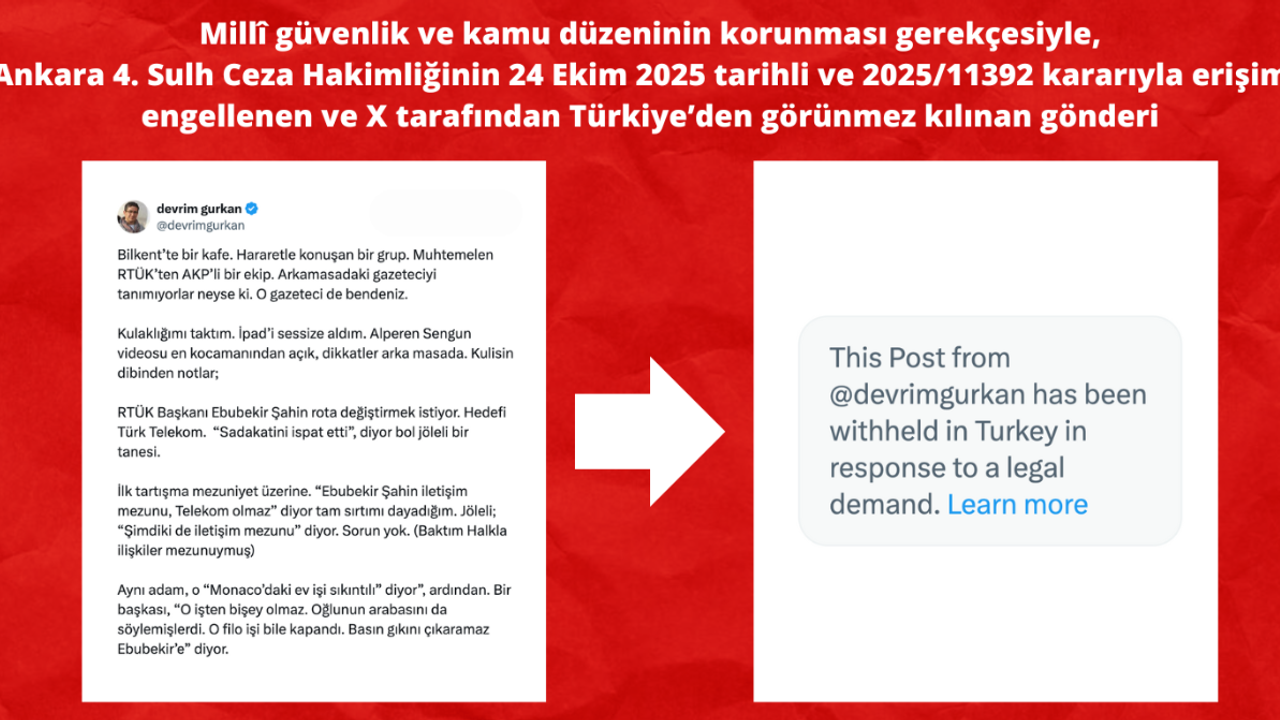 RTÜK ile Türk Telekom arasında yaşanan kritik görev değişiklikleri gündemi sarsarken, gazeteci Devrim Gürkan’ın sosyal medyada paylaştığı kulis bilgileri Türkiye’de erişime engellendi. Gürkan’ın yaklaşık 1,3 milyon görüntülemeye ulaşan tweet dizisi, “milli güvenlik ve kamu düzeninin korunması” gerekçesiyle Ankara 4. Sulh Ceza Hakimliğinin 24 Ekim 2025 tarihli ve 2025/11392 sayılı kararıyla erişime kapatıldı.