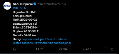 AFAD verilerine göre göre, Ege Denizi'nde saat 22.05’te 3.8 büyüklüğünde deprem kaydedildi. Depremin yerin 34 kilometre altında meydana geldiği tespit edildi.