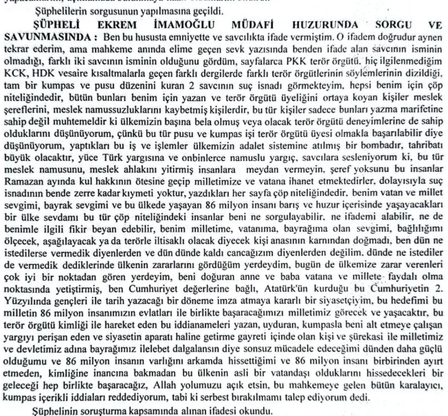 İmamoğlu’nun 23 Mart’ta verdiği ifadede, “Tam bir kumpas ve pusu düzenini kuran 2 savcının suç isnatını görmekteyim. Hepsi benim için çöp niteliğindedir.” ifadelerini kullanmıştı.