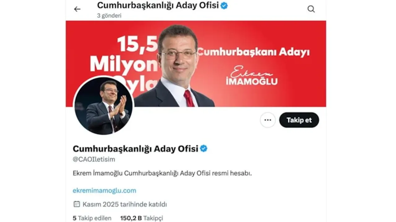 CHP’nin tutuklu Cumhurbaşkanı adayı Ekrem İmamoğlu’nun Cumhurbaşkanlığı Aday Ofisi için kullanılan hesabı, X platformu tarafından “milli güvenlik ve kamu düzenini koruma” gerekçesiyle erişime kapatıldı. Daha önce farklı kullanıcı adlarıyla üç kez engellenen hesapların ardından, @CAOIletisim adıyla yeni bir hesap oluşturuldu. İmamoğlu’nun yeni hesabından yaptığı paylaşımlar kısa sürede büyük ilgi gördü.