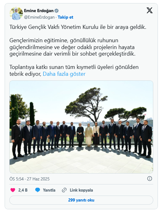 Emine Erdoğan, sosyal medya hesabı üzerinden yaptığı açıklamada, “Türkiye Gençlik Vakfı Yönetim Kurulu ile bir araya geldik. Gençlerimizin eğitimine, gönüllülük ruhunun güçlendirilmesine ve değer odaklı projelerin hayata geçirilmesine dair verimli bir sohbet gerçekleştirdik” ifadelerine yer verdi.