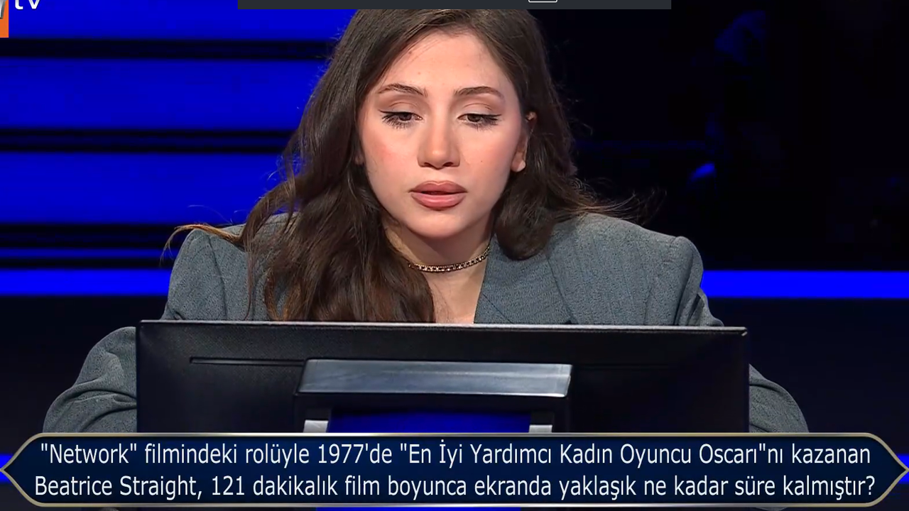 Kim Milyoner Olmak İster’in son bölümünde sorulan sinema sorusu, filmin süresi ve oyuncunun ekranda görünme süresiyle ilgili detayı merak eden izleyicilerin gündemine geldi. 1977’de “En İyi Yardımcı Kadın Oyuncu Oscar’ı”nı kazanan Beatrice Straight’in performansının filmde ne kadar yer tuttuğu araştırıldı.