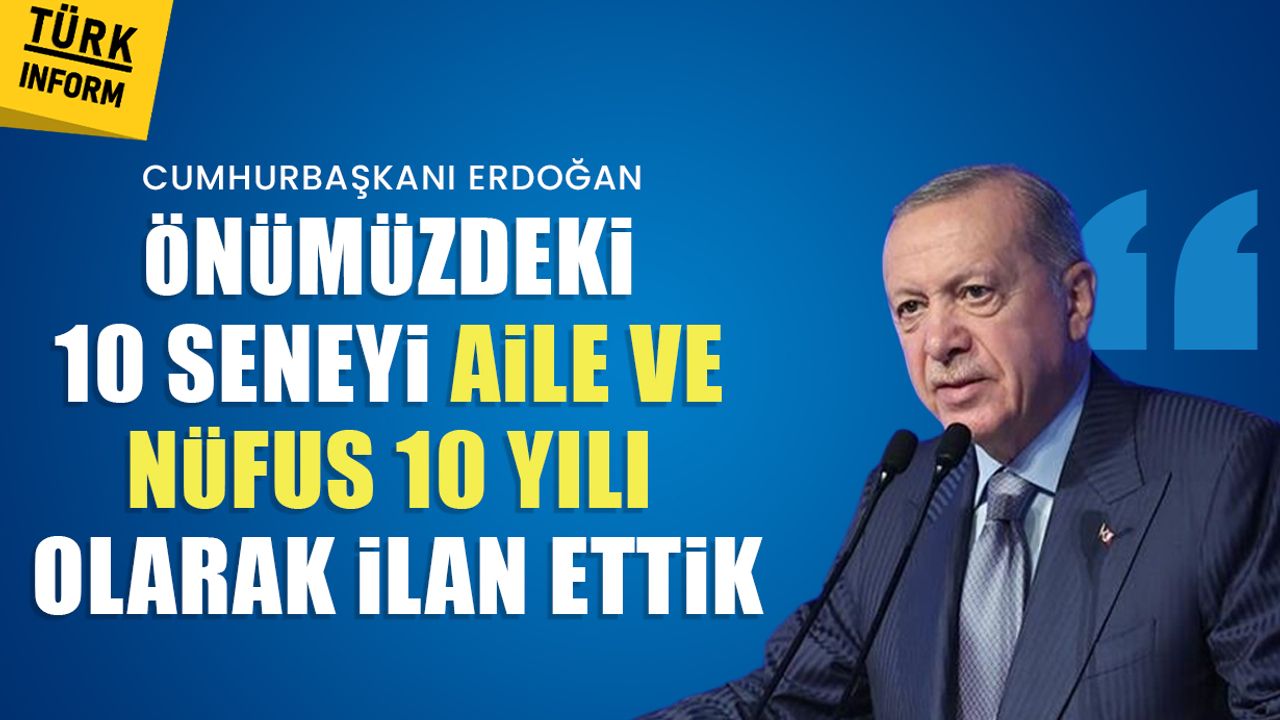 Erdoğan, konuşmasında önümüzdeki 10 senenin “Aile ve Nüfus 10 Yılı” olarak belirlendiğini ifade etti. Bu kapsamda aileyi destekleyen uygulamaların güçlendirileceğini belirten Erdoğan, evlilik öncesi eğitim, aile eğitim programları ve gençlere yönelik desteklerin sürdürüleceğini söyledi.