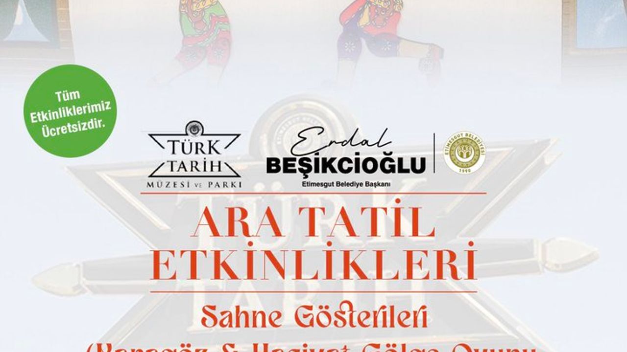 Cuma günü çalan son ders ziliyle birlikte karnelerini alan öğrenciler için ara tatil heyecanı devam ederken, Etimesgut Belediyesi çocuklara yönelik tatil etkinliklerini sürdürüyor. Belediye tarafından yapılan açıklamaya göre, ara tatili verimli ve keyifli geçirmek isteyen çocuklar için Türk Tarih Müzesi ve Parkı’nda çeşitli etkinlikler düzenleniyor.