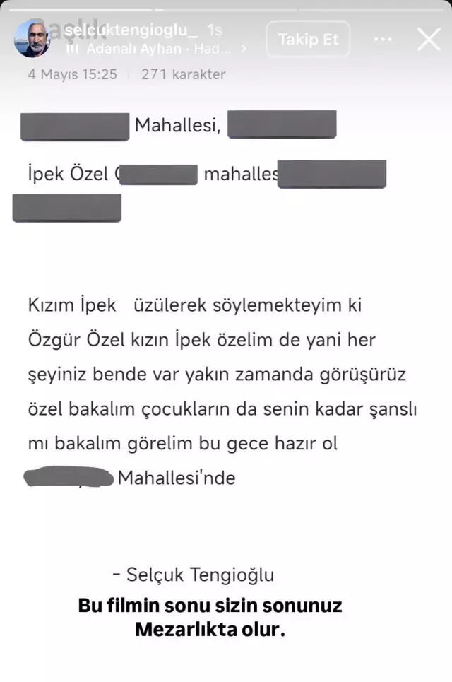 Olayın fitilini ateşleyen gelişme, geçtiğimiz günlerde Atatürk Kültür Merkezi'nde düzenlenen cenaze töreni sonrası yaşandı. Özgür Özel, burada TBMM Başkanvekili ve DEM Parti Milletvekili Sırrı Süreyya Önder’in cenazesine katılmış, törenin ardından fiziksel saldırıya uğramıştı. Saldırının ardından sosyal medya platformlarında açılan bazı hesaplardan Özel’in kendisi ve ailesi hakkında ağır tehditler içeren paylaşımlar yapılmaya başlandı. Bu paylaşımlar arasında en dikkat çekeni ise, İpek Özel’in açık ev adresinin paylaşılması ve “Bu filmin sonu sizin sonunuz mezarlıkta olur” gibi ifadelerle tehdit edilmesiydi. Aynı hesaptan paylaşılan başka mesajlarda, daha önce cinayetle suçlanan bir saldırganın övülmesi ve Özgür Özel’in eşi ile çocuğuna yönelik ağır tehditlerin yer alması, durumun ciddiyetini gözler önüne serdi.23 yaşındaki M.A. tutuklandı