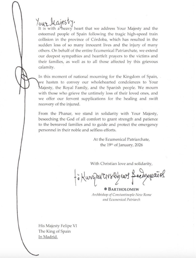 Fener Rum Patriği Bartholomeos, İspanya’nın Cordoba eyaletinde meydana gelen yüksek hızlı tren kazası nedeniyle İspanya Kralı 6. Felipe’ye bir taziye mektubu gönderdi. Kazada hayatını kaybedenler için başsağlığı, yaralılar için şifa dileklerinin iletildiği ve İspanyol halkıyla dayanışma mesajı verilen mektupta; Bartholomeos kendisinden "Konstantinopolis ve Yeni Roma Başpiskoposu Ekümenik Patrik" olarak bahsetti. Mektupta ayrıca Ekümenik Patrikhane adına dualar edildiği belirtildi. Bu ifadenin yabancı bir devlet başkanına yazılan resmi metinde yer alması üzerine sosyal medyada konuya ilişkin paylaşımlar yapıldı.