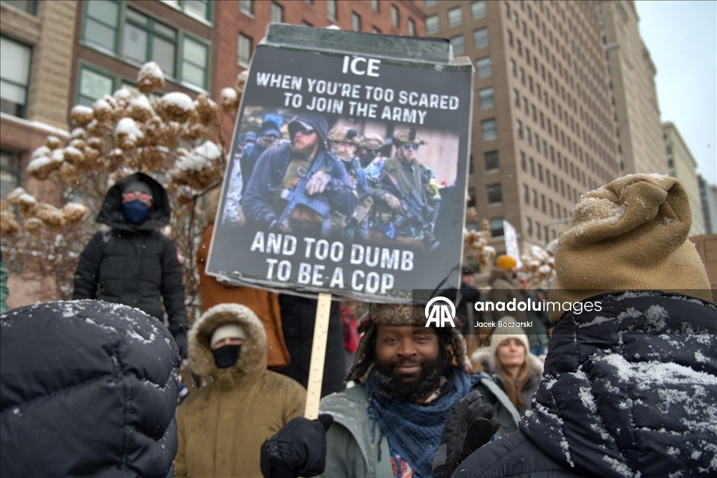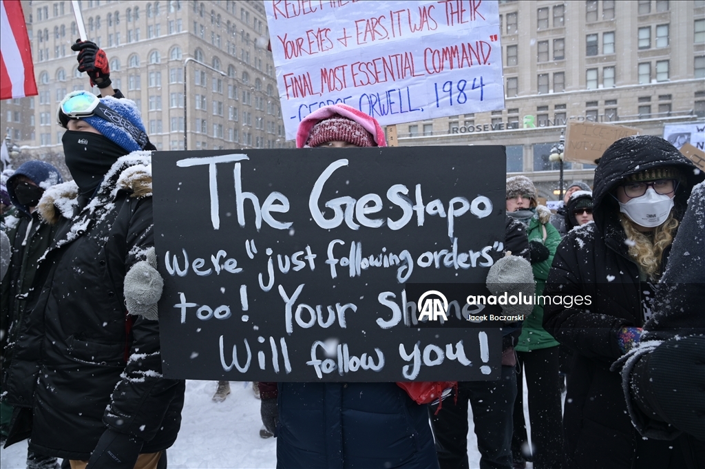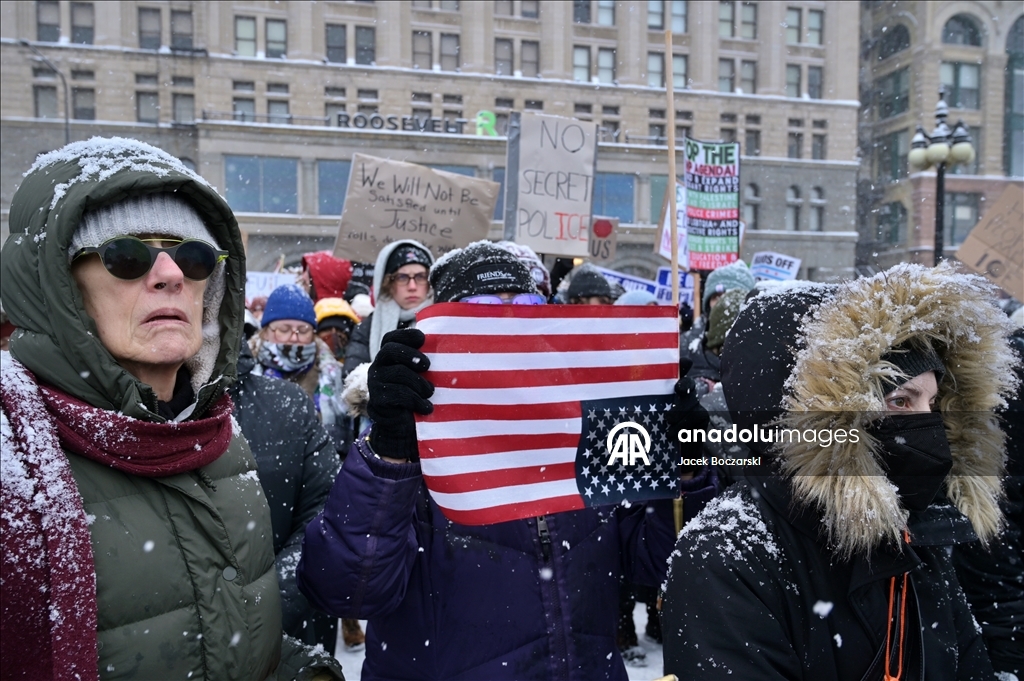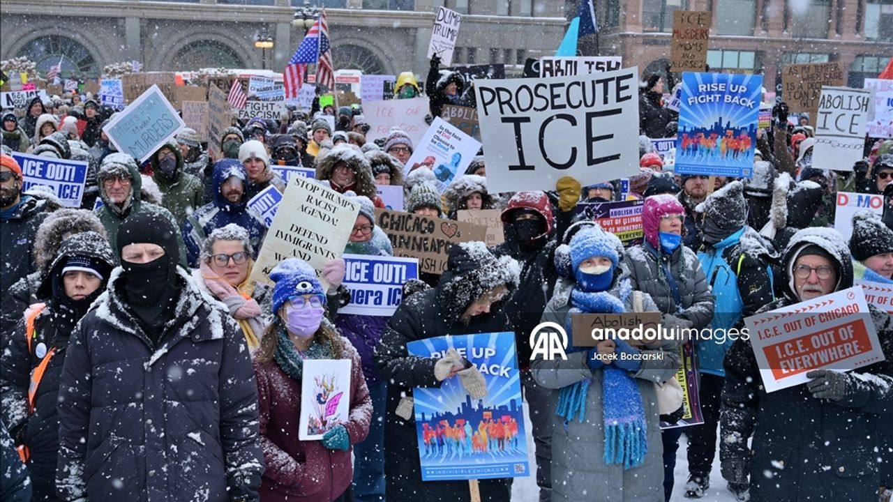Protestocular yoğun kar fırtınası altında ABD Göçmenlik ve Gümrük Muhafaza Bürosu (ICE) ve Gümrük ve Sınır Koruma Bürosu’nu (CBP) protesto etti; binlerce kişi federal göçmenlik politikalarına karşı sloganlar attı.