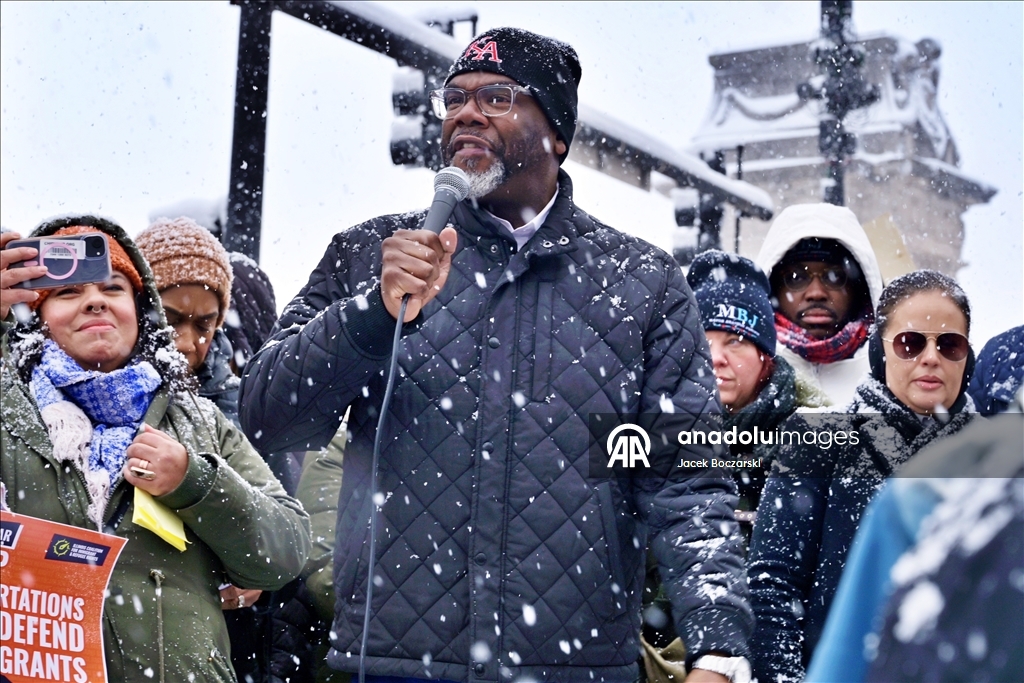 Michigan Caddesi’ndeki yoğun kar ve soğuk hava koşullarına rağmen toplanan binlerce kişi federal göçmenlik politikalarına tepkilerini yüksek sesle dile getirdi.