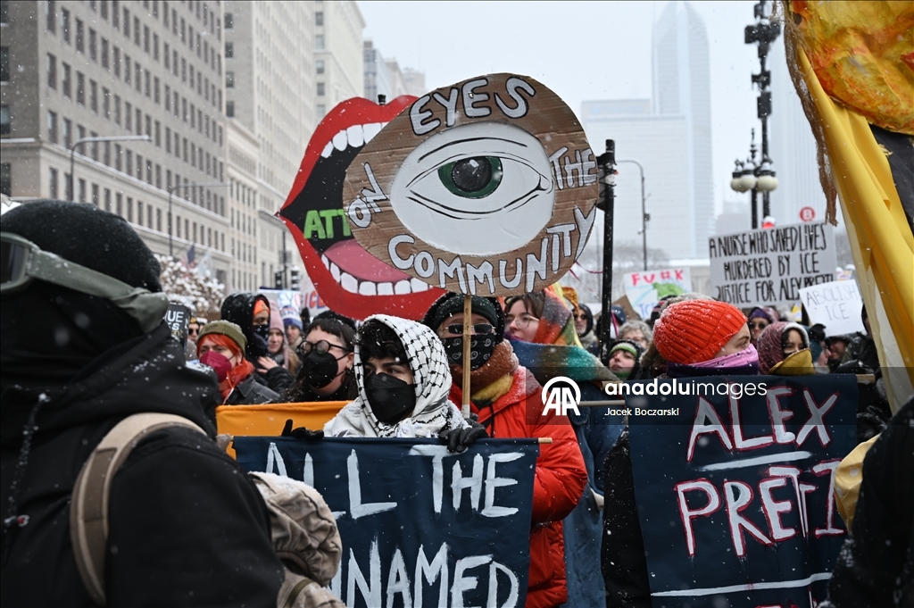 Alex Pretti’nin ölümüne ilişkin Chicago’daki gösteride katılımcılar federal göçmenlik uygulamalarına karşı pankartlar taşıdı ve slogan attı.