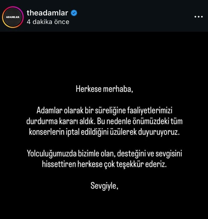 Adamlar, resmi sosyal medya hesabından yaptığı paylaşımda bir süreliğine faaliyetlerine ara verdiklerini açıkladı. Açıklamada, “Adamlar olarak bir süreliğine faaliyetlerimizi durdurma kararı aldık. Bu nedenle önümüzdeki tüm konserlerin iptal edildiğini üzülerek duyuruyoruz. Yolculuğumuzda bizimle olan, desteğini ve sevgisini hissettiren herkese çok teşekkür ederiz” ifadeleri yer aldı.