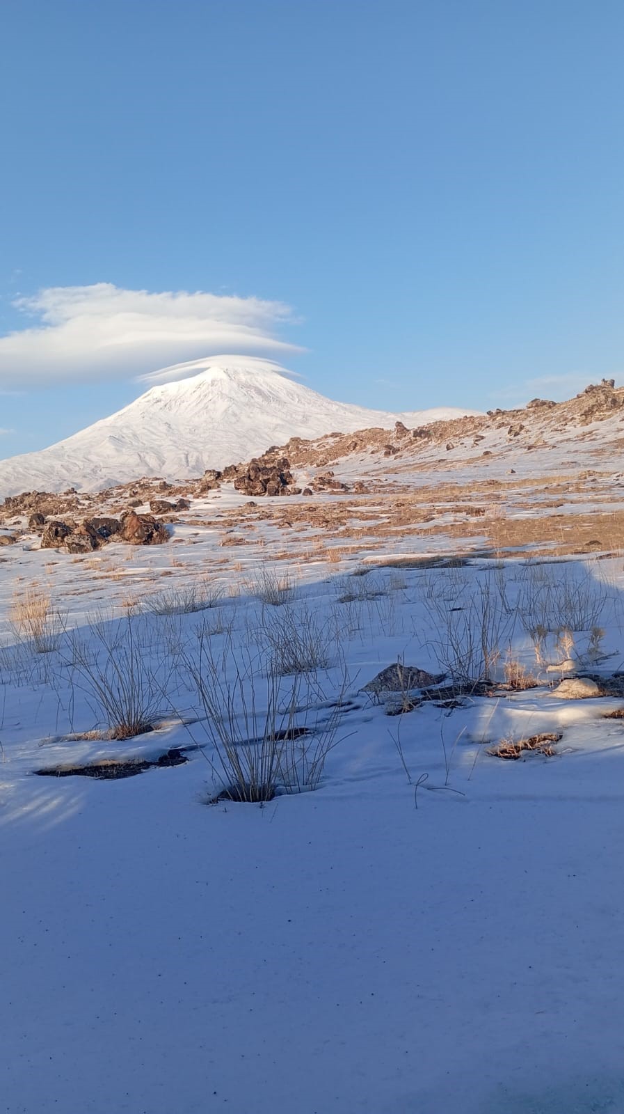 Ağrı Dağı’nın zirvesinde oluşan mercek bulutu, görenleri hayran bıraktı. Halk arasında “şapka” olarak adlandırılan bu nadir doğa olayı, karla kaplı zirveyi tamamen sararak eşsiz görüntüler oluşturdu.