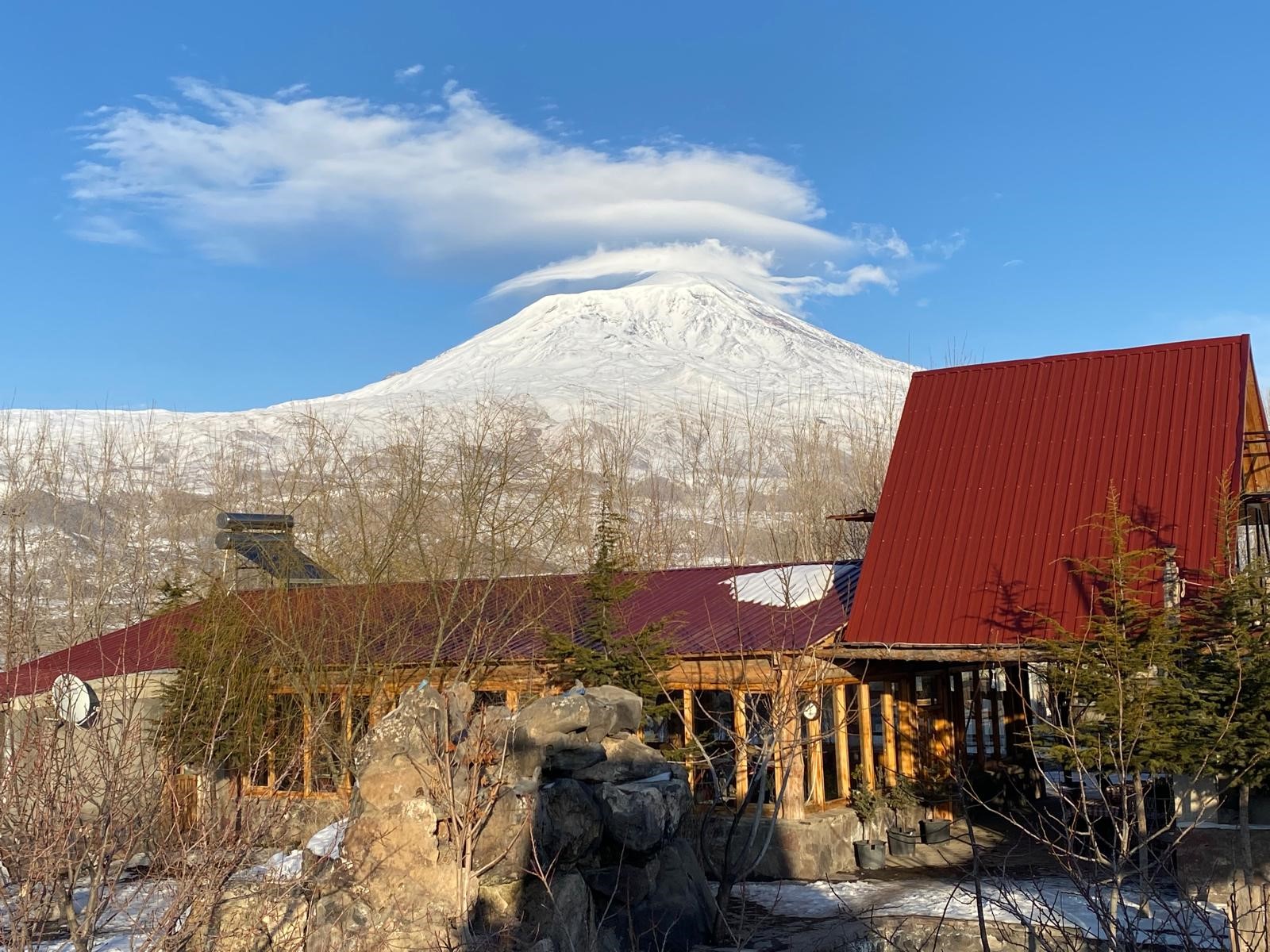 Meteorolojik koşulların etkisiyle meydana gelen mercek bulutu, dağın zirvesinde dairesel ve şapka biçimini andıran bir görünüm oluşturdu. Bulut, Ağrı Dağı’nın heybetli siluetini daha da belirgin hale getirdi.
