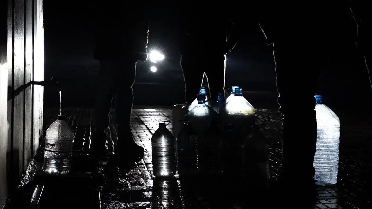 Gece geç saatlerde işten dönen vatandaşlar, telefon ışıkları ve araç farlarıyla aydınlattıkları sırada su temin ediyor.