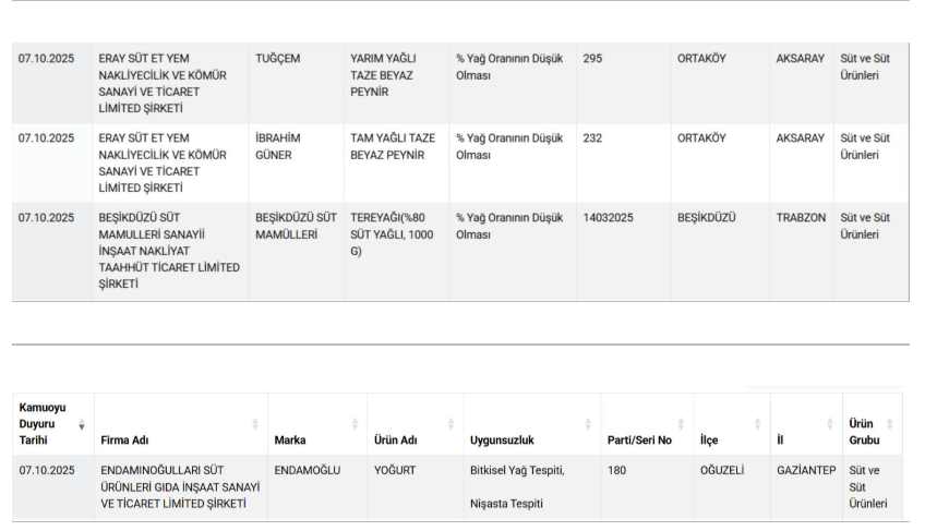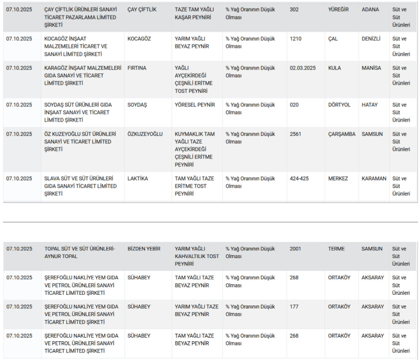 Tarım ve Orman Bakanlığı, Türkiye genelinde yaptığı gıda denetimlerinde 12 peynir, 1 tereyağı ve 1 yoğurt markasında uygunsuzluk tespit etti. Denetimler sonucunda bazı ürünlerde yağ oranlarının düşük olduğu, yoğurtta ise nişasta ve bitkisel yağ bulunduğu ortaya çıktı.